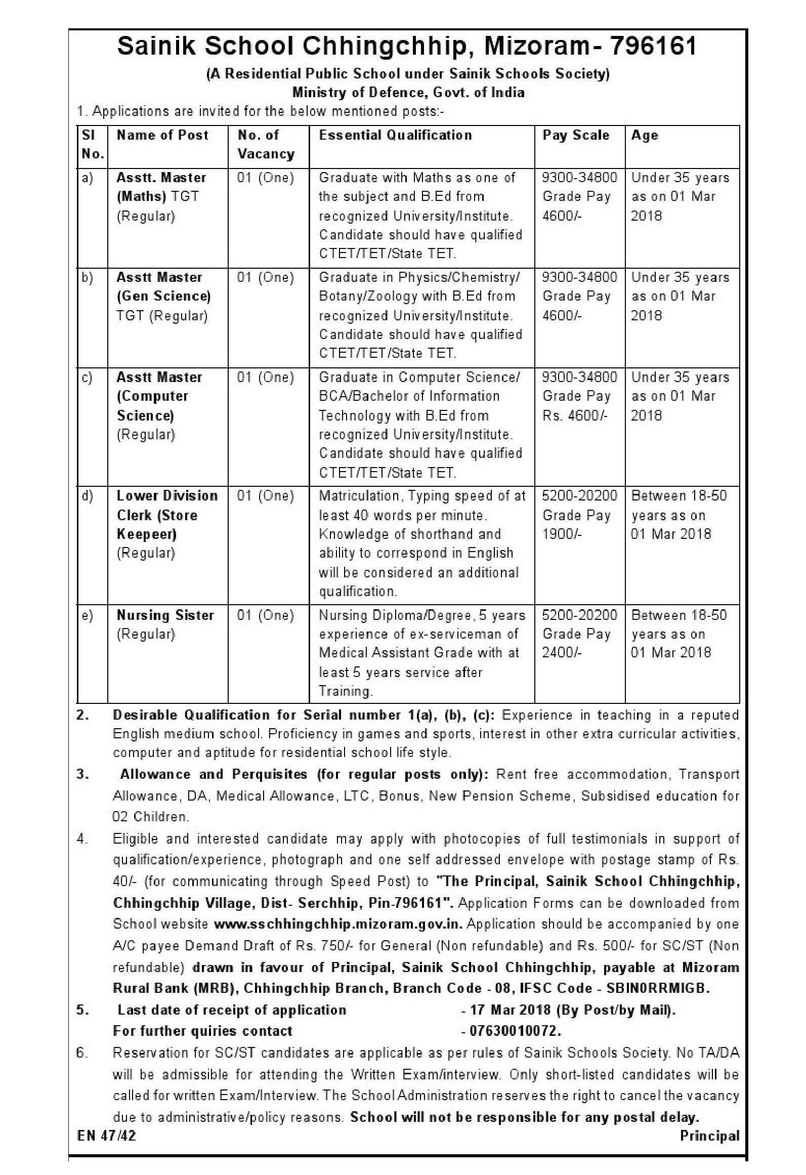 Chhing Chhip Sainic School Staff Nurse Vacancy 2018 Latest Govt jobs Sainic School Chhing chhip Mizoram Invited for following jobs Assistant Master (maths) TGT (Regular) Assistant Master (General science) TGT (Regular) Assistant Master (Computer science) (Regular), Lower division clerk (store keeper) (Regular) Nursing Sister (Regular)