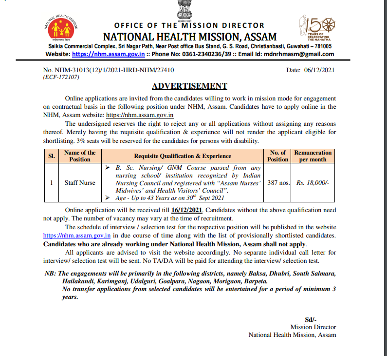 NHM Assam Recruitment 2021 jobs Staff nurse